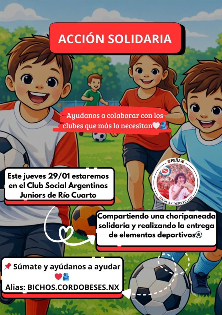 La llegada de Argentinos Juniors activa otra jornada solidaria de la Peña “Bichos Cordobeses”, que llevará donaciones y acompañamiento al club Argentinos Juniors de Las Delicias, fortaleciendo lazos entre hinchas y comunidad.
